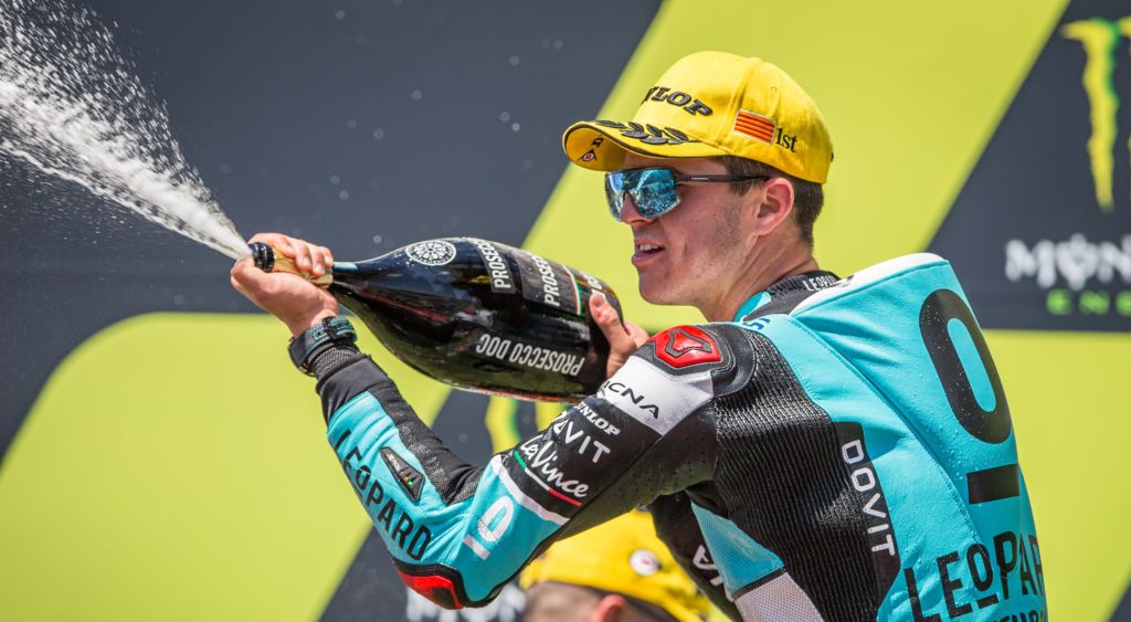In the remaining four corners, no one was able to challenge Marcos Ramirez (Leopard Racing) who inherited the lead after Toba’s crash. Aron Canet had a go a passing Ramirez into the final corner, but Ramirez’ entry speed was too much for the #44, who remained second. Ramirez’ first win comes at one of his home Grands Prix. Although an Andalusian, to take his first victory in Spain will be a special point in the #42’s career. It has not been a stunning season so far from Ramirez who re-joined the team with whom he fought for the 2016 CEV Moto3 Junior World Championship, but this could prove an important moment in his season, as he became the twelfth winner in as many races in the lightweight class.