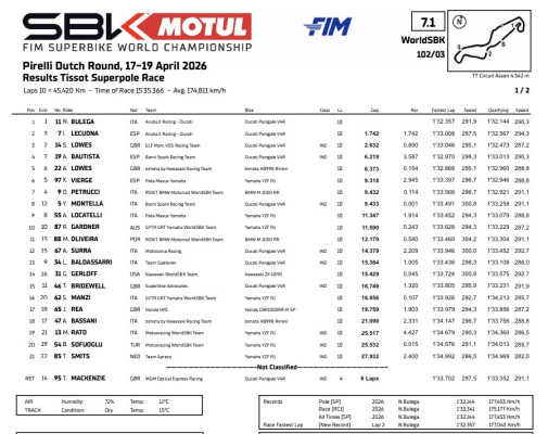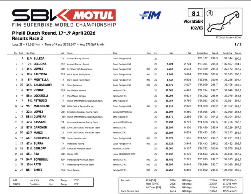 Unusually for WorldSBK, all the riders finished the race under overcast conditions in Assen.  Ultimately though, no one could tame Bulega who romped to a Razgatlioglu-equalling 13 race wins on the trot.