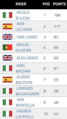 Xavi Vierge was the biggest mover at the start of Sunday morning’s 10-lap affair while Alex Lowes went the other way.  The top three held positions throughout the race as Bulega made it 12 race wins in a row.