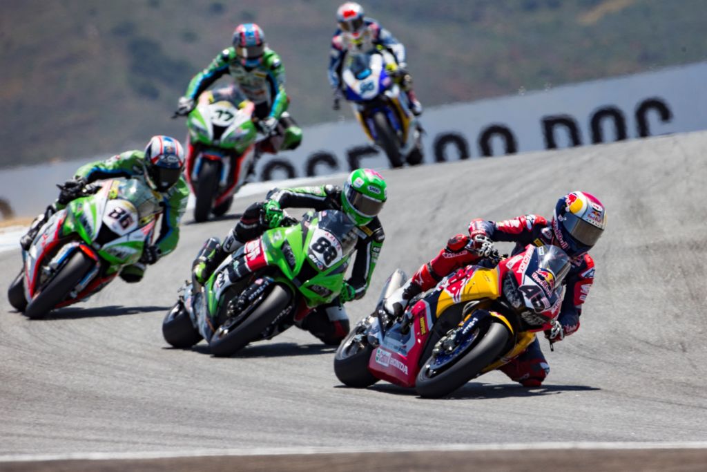 Turn five is a fairly simple, flat right hander, but the radius combined with the relative lack of camber means that it is easy to get sucked in, but the important thing here is the corner exit, because there is then a reasonably long run to turn six through the un-numbered right kink. There is a lot of camber to offer a lot of support in turn six, meaning there is potential for a pass. Turn seven is very fast, on the left side of the tyre. As Always the riders are on the limit of the track boundaries on the exit, and track boundaries in Laguna are enforced not by the Race Direction but by the run-off areas themselves, which are largely gravel – rest easy Mr. Haydon. After the run down the Corkscrew, it is the tricky Rainey Corner, where the riders push the front hard as the downhill run continues before another heavily cambered corner at the penultimate turn. Finally, the last corner is the best overtaking spot, as highlighted by Eugene Laverty in 2013, but as Casey Stoner showed in the MotoGP race back in 2008, it is also quite easy to make a race-deciding mistake at turn twelve.